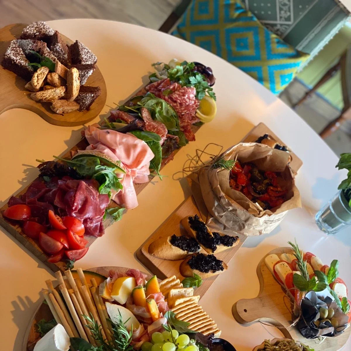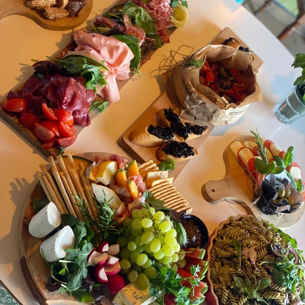 Parmaskinka, Melon, Mortadella, Marinerade oliver, Soltorkade tomater, caprese sallad /tomat, mozarella, basilika, pesto/, cambozola, valnötter, vindruvor, inlagda grönsaker / zucchini, kronärtskocka etc. Pastasallad med ruccola, nybakad ciabata oliv, mandelskorpar, chokladbit