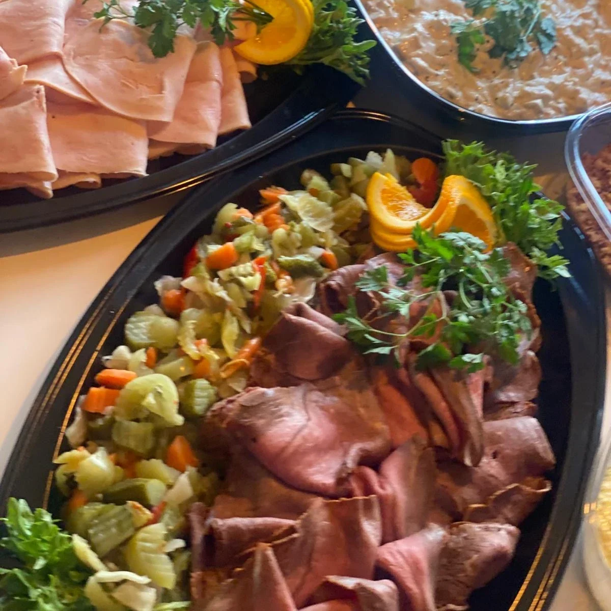 färskrökt lax, hovmästarsås, rödvinsmarinerad rostbiff, pickles, rostad lök, ägghalva toppad med västkustsallad och kaviar i rökt kalkon, fruktsallad, potatissallad / lrämig eller vinegrette/ bulgursallad, nybakat bröd, smör, garnering/frukt och grönsaker /blåbärspaj
